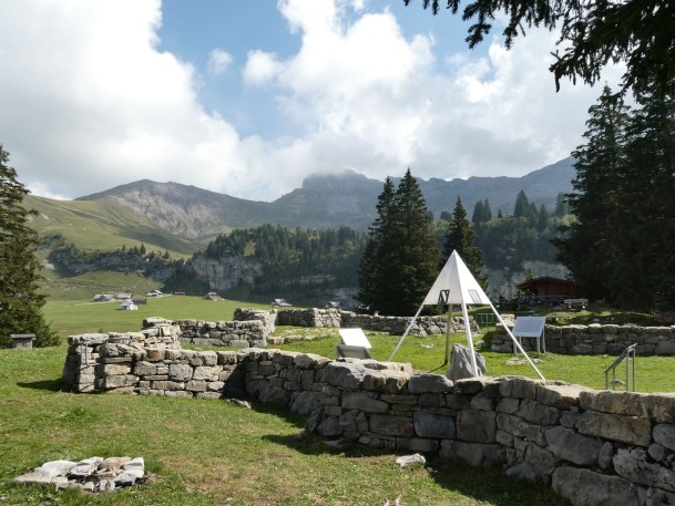 Nun bin ich also am Mittelpunkt der Schweiz, dem Vielbeschriebenen. Ich umrunde ihn ein paar Mal auf der Trockenmauer, die den Stein mit dem Pyramidendach umgibt. Und denke bald, wie ein ungeduldiges Kind: «Können wir weitergehen?» Denn ich habe noch ein ziemliches Stück vor mir: Als Wanderung muss man sich das Älggi verdienen, es ist nicht unter sechs Stunden zu erreichen – kürzer höchstens mithilfe des Rufbusses oder eines Autos.