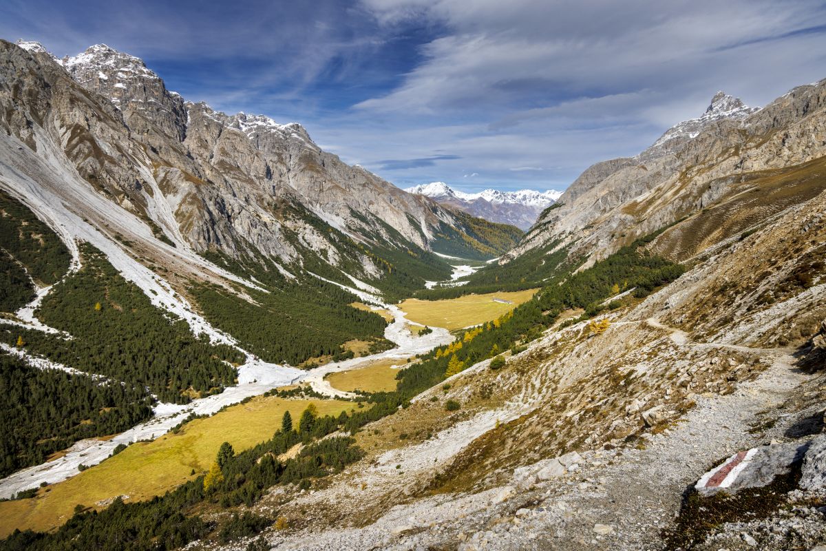 Der Wanderweg durch das Val Mingèr führt durch Lärchen- und Föhrenwälder dem Wildbach Ova da Mingèr entlang ständig bergauf. Das Wasser befördert hier so viel Geschiebe von den umliegenden Steilhängen herunter, dass sich die Landschaft immer wieder verändert. Dort, wo der Weg noch immer der uralten Routenführung folgt, sind öfters dunkle Stellen sichtbar, wo lange vor der Gründung des Nationalparks Kohlemeiler angezündet wurden.