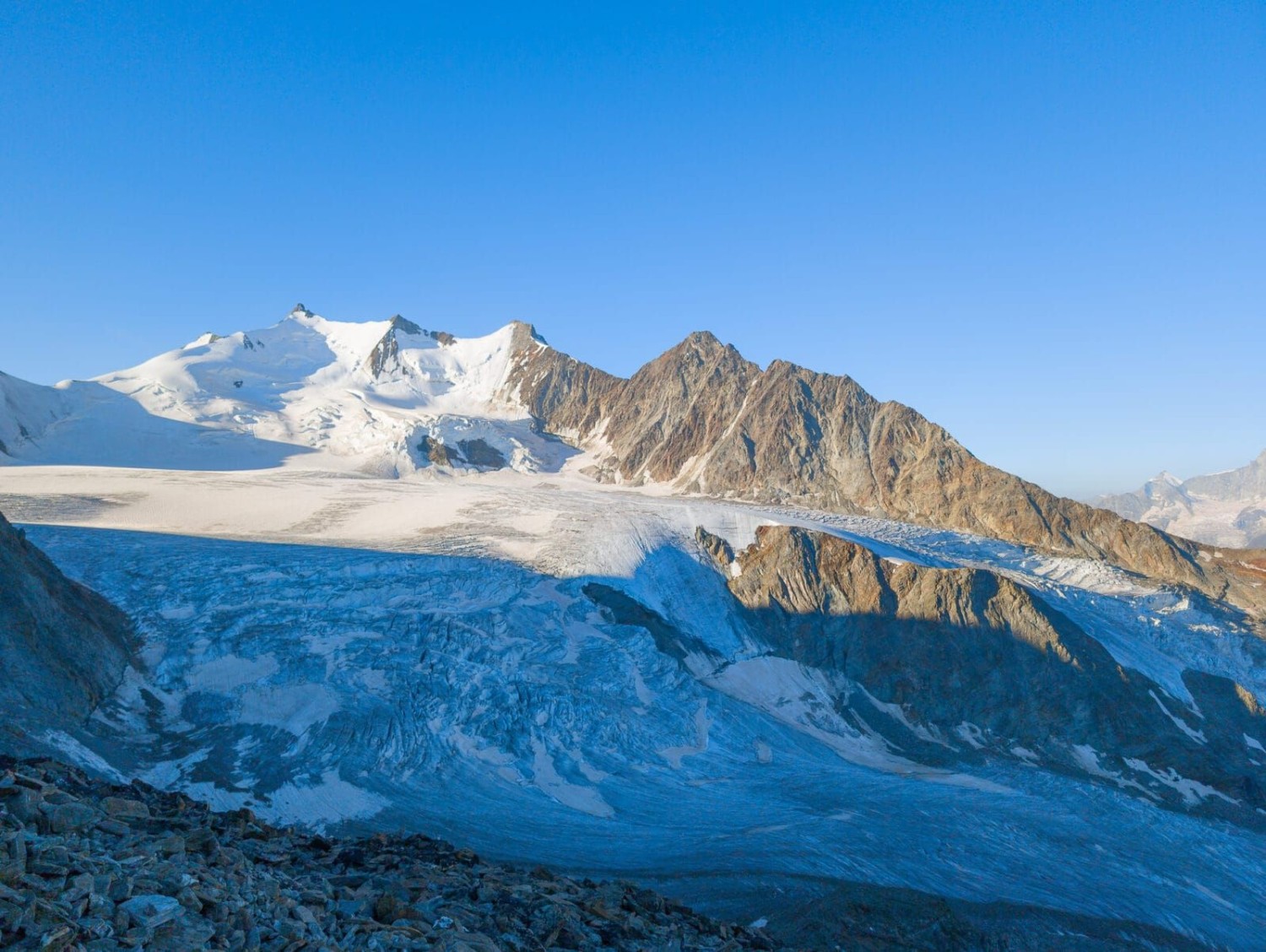 Hier angekommen, tanken wir unsere Batterien auf und verbringen zusammen einen geselligen Abend. Am nächsten Morgen werden wir bei aufgehender Sonne die Wanderschuhe schnüren. Der Anstieg ist anfangs steil, wird aber flacher, sobald man den Grat erreicht, der vom Klein zum Gross Bigerhorn führt. Auf dem Weg zum Gipfel bietet sich ein grandioses Panorama mit Blick auf zahlreiche Gletscher und Viertausender. Die letzten Meter sind anspruchsvoll, aber die Aussicht auf dem Gipfel ist die Mühe allemal wert.