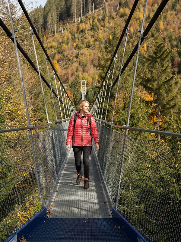 Zur Recherche: Nach ein paar Gesprächen mit einer Psychologin zum Thema Angst und einem Mentalcoach zum Thema Menschen mit Angst tat sich mir die Möglichkeit auf, mit einer Coachin an meiner eigenen Höhenangst zu arbeiten. Also traf ich mich eines schönen, aber sehr stürmischen Tages mit Beatrice Jaccard bei der Hängebrücke Sattel-Hochstuckli. Dunt-dunt-duuunt… Etwas nervös war ich schon, gehört die Hängebrücke zu einem meiner verhasstesten Bauwerke (nebst Hallenbädern und Hochhäusern aus den 1960ern), weil sie einfach so verdammt hoch sind, wippen und schaukeln, sich bewegen und man teilweise auch noch durch den Gitterrost am Boden in die Tiefe sehen kann. Es gibt tatsächlich keine Hängebrücke, über die ich nicht komplett angespannt, aber mit butterweichen Knien, mich am Geländer festklammernd und so schnell wie möglich gehuscht bin. Stehen bleiben gab es nicht, genausowenig, wie links oder rechts oder nach unten zu schauen.
