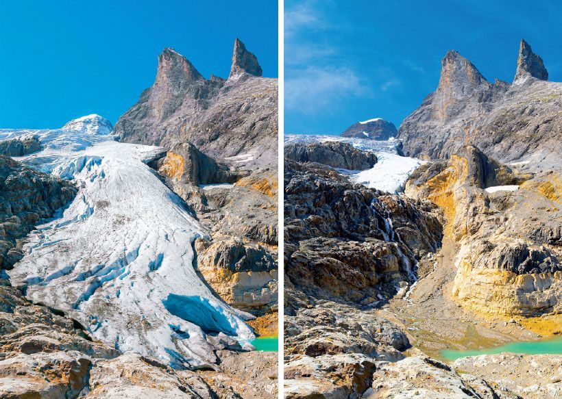 Die ältesten Bilder – meist Panoramaaufnahmen – sind gerade mal 20 Jahre alt. Die Vergleichsbilder zeigen auf, wie stark die Gletscher in dieser relativ kurzen Zeitspanne zurückgeschmolzen sind, z.B. beim Triftgletscher im Berner Oberland ist heute ein riesiger See, wo vorher Eis war. Besonders kleinere Gletscher sind sehr anfällig auf die klimatischen Veränderungen und haben prozentual stark an Fläche verloren. So sieht man auf den Vergleichsbildern auch immer mehr Schutt statt Eis.