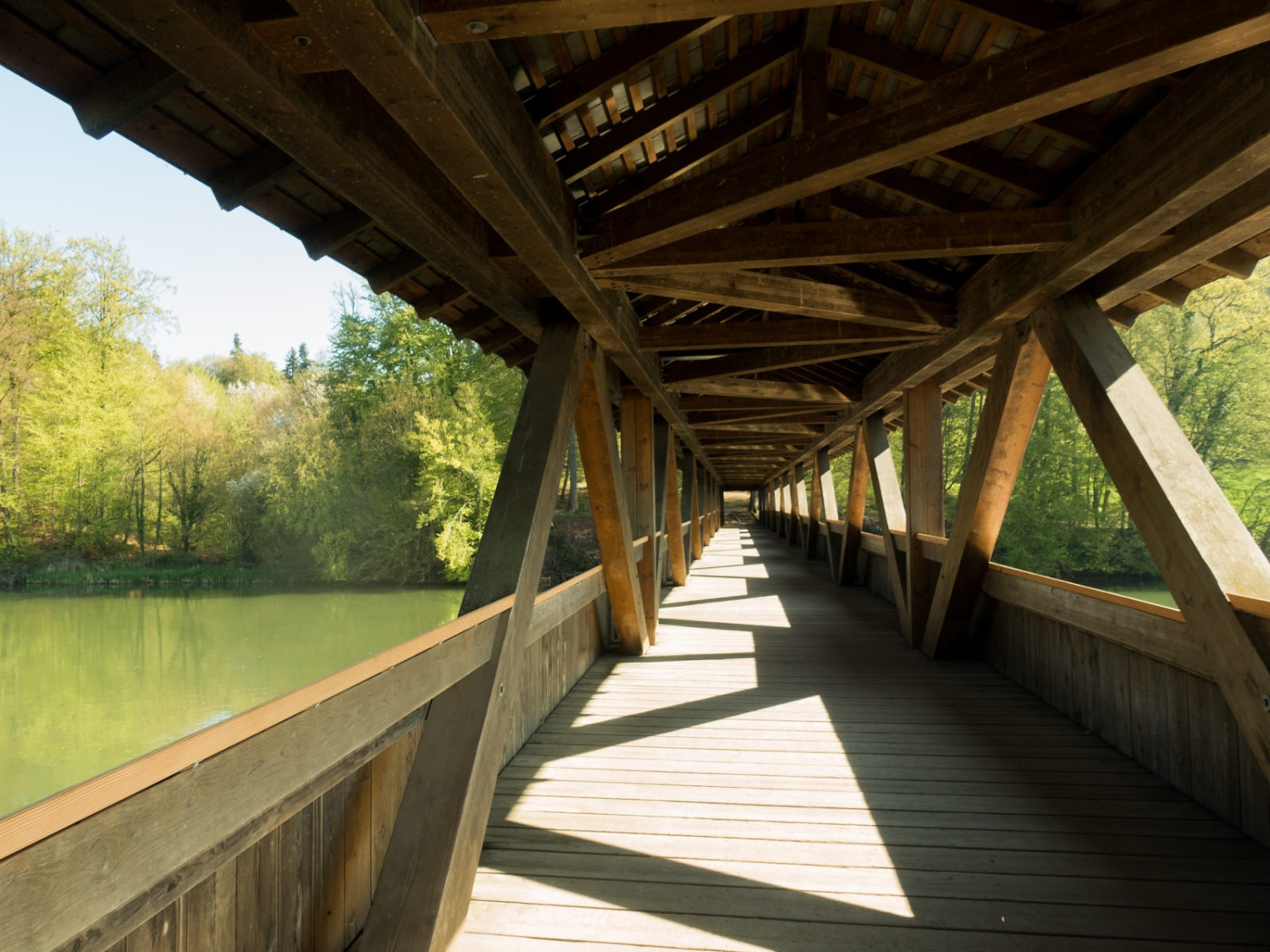 Rheinfelden, die Stadt am Rhein, ist die älteste Zähringerstadt der Schweiz. Bei einem Stadt~ rundgang lassen sich die mittelalterlichen Türme und Torbogen, die alte Rheinbrücke und die kunstvoll verzierten Hausfassaden der autofreien Altstadt bestaunen. Die Wanderung nach Stein beginnt beim bekannten Kurzentrum. «Sole uno» heisst die moderne Bade‑Erlebniswelt und die Sole bzw. das Salz sind auch wichtiger Teil der Stadtgeschichte. Im Jahre 1844 wurden zwei Salinen gegründet, die Natursole schon bald zum Baden verwendet. Im Kurpark steht noch ein Sole‑Förderturm aus der Pionierzeit und ist heute als Museum eingerichtet. Vorbei am neuen Kraftwerk führt die Route weiter den Rhein entlang. Auf der deutschen Seite des Flusses zeigt sich das Umgehungsgewässer, ein Fischpass, der beim Bau des neuen Kraftwerkes eingerichtet worden war. Bald erreicht man in Ryburg‑Schwörstadt ein weiteres Flusskraftwerk, das stärkste am Hochrhein. Doch nicht nur Technik herrscht vor, die Route überrascht durch ihren fast durch~ gehenden Verlauf durch die Uferwälder des Rheins; am Weg liegen die Ruinen mehrerer römischer Wachtürme. Auch lässt die Wanderung Raum für Exkursionen: etwa eine Besichtigung der Saline Ryburg oder ein Besuch der Storchensiedlung in Möhlin. Am Ziel, in Stein AG, bietet sich dann die Gelegenheit, hinüber nach Baden Württemberg zu bummeln. Die gedeckte Holzbrücke zwischen Stein und Bad Säckingen ist mit 203,7 Metern die längste Holzbrücke Europas. Die Alte Rheinbrücke, wie sie auch genannt wird, steht nur Fussgängern und Velofahrern zur Verfügung. Und Bad Säckingen verlockt mit einer schönen Altstadt zum Einkaufs‑ und Beizenbummel. Ausweis nicht vergessen!
