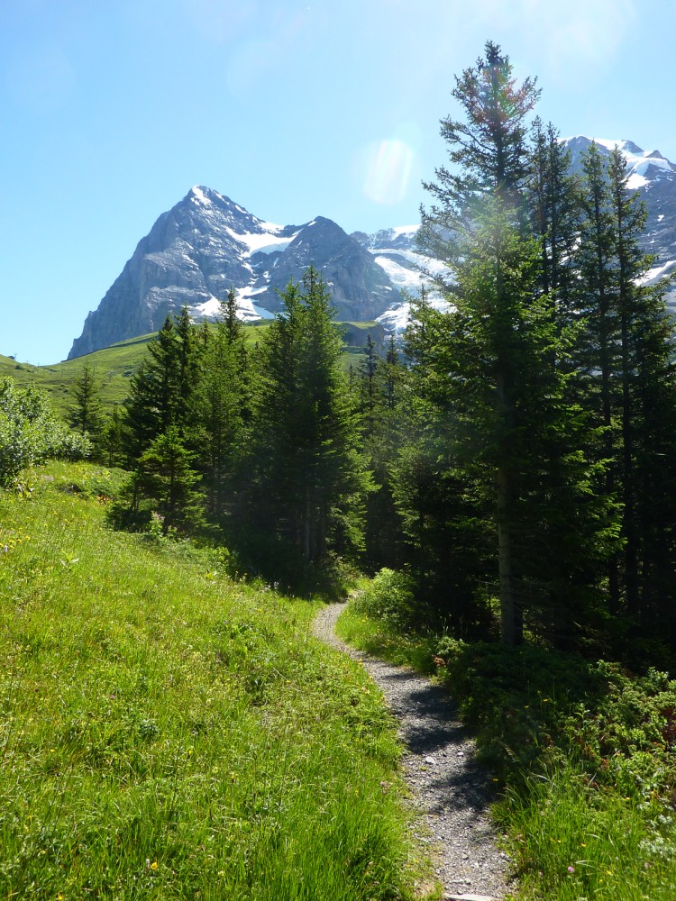 Ab Grindelwald oder Lauterbrunnen trägt die Bahn einen bequem über die 2000-Meter-Grenze auf die Kleine Scheidegg, den Ausgangspunkt dieser spektakulären Bergtour vor imposantester Bergkulisse. Alle andern gehen am Hotel Bellevue vorbei, steigen zum Kiesweg hinauf, der parallel oberhalb der Bahnlinie verläuft, und wandern bis zur Loucherflue, wo sich der Weg gabelt. Diese Route führt über den ganz linken, direkteren etwas unterhalb der Station Eigergletscher. Hier beginnt der Eiger-Trail, wie es gross angeschrieben steht. Über die steilen Alpweiden und Geröllhalden der Alp Wärgistal geht man bald am Fuss der imposanten, vielbeschriebenen Eigernordwand und staunt ab der imposanten Bergwelt. Bloss 30 Meter fehlen dem Eiger übrigens zum Viertausender. Nun führt die Route stetig abwärts, und der Blick schweift zum Wetterhorn und der Grossen Scheidegg. Beim Wasserfall wird der Weg etwas rauer. An der Kreuzung mit dem Wegweiser zur Gletscherschlucht könnte man nach Grindelwald hinuntersteigen, doch diese Route biegt links ab und führt, zum Teil mit Seilen gesichert, nach Alpiglen. Wer mag, kann sich dort im Restaurant auf die Sonnenterasse sitzen und den Ausblick geniessen. Alpiglen ist auch Haltestelle der Wengernalpbahn, wer genug gewandert ist, kann sich nach Grindelwald hinunterfahren lassen. Wer noch in der Bergwelt verweilen möchte, geht weiter auf dem nun weiss-gelb-weissen Wanderweg dem Bahntrassee entlang, bei der Gabelung führt diese Route über den Weg rechts in den Wald hinunter, aber auch die links gelangt man zur Bahnstation Brandegg.