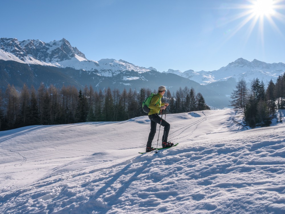 Diese aussichtsreiche Winterwanderung dauert nur etwas mehr als zwei Stunden und ist wenig anspruchsvoll. Wer sich aber Zeit nehmen will, kann den sonnigen Panoramaweg Somtgant mit einem Aufenthalt in einem der drei Betriebe in Radons genussvoll auf zwei Tage verlängern. Denn der kleine Weiler im Val Nandro bietet für jedes Portemonnaie etwas Passendes: von den weitherum bekannten Pommes frites des Restaurants Muntanela bis hin zum doppelten Kalbskotelett aus der lokalen Zucht von japanischen Wagyū- und von Swiss-Brown-Rindern im Berghuus Radons. Doch der kulinarische Genuss soll zuerst verdient sein: Von der Bergbahnstation Somtgant aus geht es über die gleichnamige Alp erst fast ebenen Wegs ins Tal hinein, bevor der Weg kurvenreich nach Radons absteigt. Man wandert durch eines der grössten zusammenhängenden Alpgebiete Graubündens in der Grösse von 7500 Fussballfeldern. 1300 Tiere übersommern jeweils hier, wo nun Skifahrende mehr oder weniger elegant den Hang hinunterkurven. Wer in Radons noch eine Stunde länger wandern will, baut den Winterwanderweg über die Maiensässhütten Bargias zur Alp Nova und wieder zurück ein. Er liegt unterhalb der Hänge, auf denen eine Solaranlage hätte gebaut werden sollen, bevor die Stimmbevölkerung von Savognin das Projekt 2024 versenkte. Der zweite Teil der Wanderung führt gemütlich und leicht absteigend zurück zur Gondelbahnstation Tigignas. Auf der ganzen Wanderung teilt man sich den Weg mit Schlittenfahrenden. Da es für diese aber eine zweite, weitaus rasantere Abfahrt im Skigebiet gibt, sollten sich hier eher die gemütlichen Kufenfans tummeln. Mit Aussicht auf das ganze Val Surses mit seinem mächtigen Piz Mitgel endet die Wanderung, bevor in Tigignas wiederum die Bergbahn nach Savognin hinunter genommen wird.