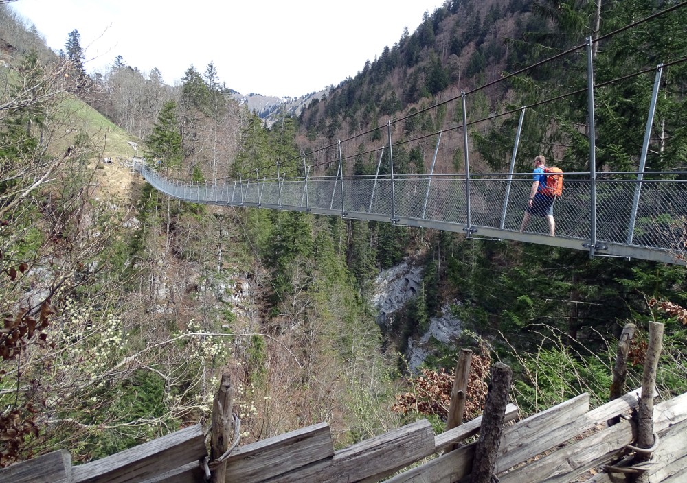 Die Hängebrücke Leiterweide führt schwindelerregend hoch über die Schlucht des Buuschebachs..
