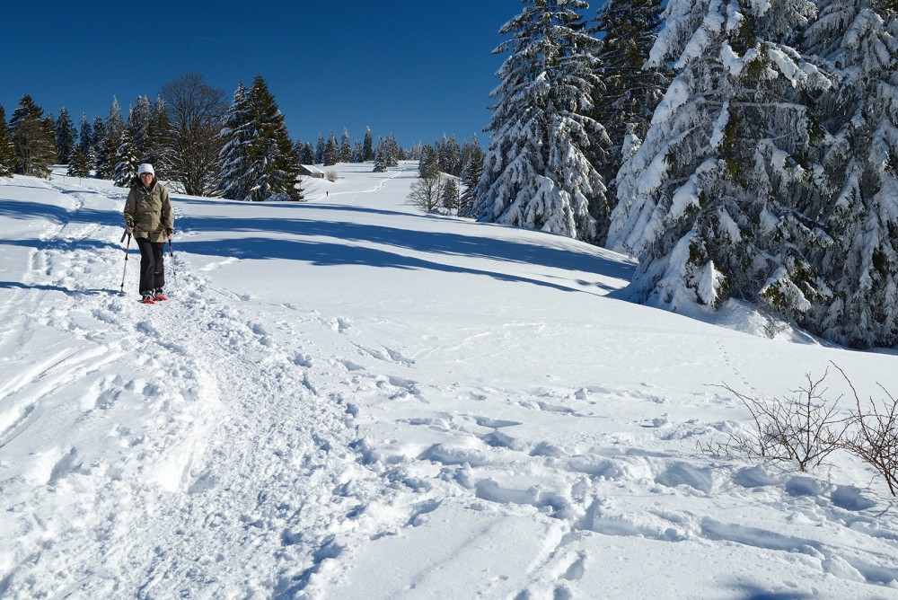 Im Jura verbindet die Passhöhe der Vue des Alpes die Städte Neuchâtel und La Chaux-de-Fonds, die Kantonshauptstadt mit der Uhrmacherstadt. Zwei markierte Schneeschuhwanderungen beginnen am Parkplatz auf der Passhöhe. Das ist praktisch für die Anreise und bietet Vorteile für Einsteiger, die erste Erfahrungen mit Schneeschuhen machen wollen. Denn beim Tourismusbüro vor Ort kann man Schneeschuhe und Stöcke ausleihen. Eine leichte Rundtour führt nach Tête de Ran und zurück. Vom Parkplatz aus geht es zunächst bis zum Ende des Skilifts wenige Meter bergauf. Dann, den pinkfarbenen Wegweisern des «Sentiers Raquettes» folgend, taucht der Schneeschuhläufer ein in den Wald. Als zusätzliche Orientierung dienen die neuen Wegweiser der nationalen Route Nr. 5, des «Chemin des crêtes» (Jurahöhenweg). Der tief verschneite Wald auf dem Kamm gibt immer wieder Blicke frei über die Jurahöhen und bis hinunter nach La Chaux-de-Fonds . Nach rund anderthalb Stunden ist das Gasthaus Hôtel Tête de Ran am Fusse des gleichnamigen Höhenzuges erreicht. Bei gutem Wetter wird auf der geräumigen Terrasse serviert, von wo sich ein schöner Blick zum Chasseral bietet. Vom Gipfel des Tête de Ran ist die Rundumsicht einfach grandios, hinüber bis nach Frankreich schweift der Blick von hier. Diese Aussicht muss jedoch verdient werden. 15 Minuten dauert der Aufstieg zum höchsten Punkt auf 1422 m ü. M. Der Rückweg führt zunächst entlang des Winterwanderweges nahe der Fahrstrasse bis zur Wirtschaft Les Gümmenen. Dort entscheidet sich der Schneeschuhläufer entweder für die Route entlang de Winterwanderweges oder aber er steigt rechts einige Meter steil hinauf, wo er wiederum auf den markierten Schneeschuhtrail trifft. Auf diesem gehts über den Kamm und durch den Wald zurück bis zur Passhöhe der Vue des Alpes.
