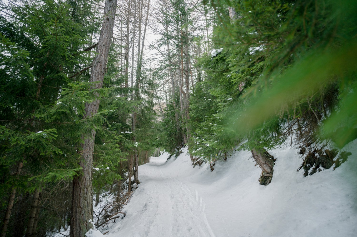 Start und Ende dieser Schneeschuhwanderung befindet sich in Visperterminen, ein Bergdorf am Eingang des Vispertals, welches auf Walliserdeutsch «Tärbinu» genannt wird. Bekannt ist der Weisswein Heida, dessen Trauben hier an einem der höchstgelegenen Weinberge Europas wachsen. Der Schneeschuhtrail führt zunächst von der Bushaltestelle Visperterminen (Talstation) durch den oberen Teil des Dorfes. In der ersten Kurve biegt man ab, um anschliessend auf einem kleinen Pfad in Richtung des Waldes zu wandern. Dort angekommen, führt einen die erste Abzweigung nach rechts. Zur Linken münden zwei weitere Pfade in denselben Weg. Über eine massive Brücke wird der mächtige Riedbach sicher überquert. Kurz über die Strasse gewandert, geht es im Lowinuwald entlang eines kleinen Baches weiter. Achtung: Dieser Wegabschnitt kann je nach Schneeverhältnissen schräg abfallend sein. Wandernde mit unsicherem Tritt biegen besser bereits nach der Überquerung des Riedbachs links ab und wandern über Oberi Bodma in Richtung Hüoterhüsi. Für die anderen heisst es jetzt auf der linken Seite halten, um in der Nähe der Lichtung Hüoterhüsi auf den nächsten Weg zu kommen. Das Hüoterhüsi heisst so, weil früher, als die Suonen noch in Betrieb waren, der Wasserhüter von dort aus für den Unterhalt der Wasserleitungen sorgte. Nun geht es zurück in Richtung Bodma. Kurz nach dem Verlassen des Waldes führt die Route bei der Verzweigung nach Undri Bodma. Auf dieser wird der Bach Bodweri-Niwa zweimal überquert. Hier schweift der Blick immer wieder in die eindrückliche Walliser Bergwelt mit ihren Viertausendern. Ab und zu zeigt sich sogar das Matterhorn. Bei einer kleineren Lichtung der Strassengerade biegt man scharf links ab, um quer über ein Feld nach Riedhof zu gelangen. Der letzte Teil führt auf Hartbelag zur selben Bushaltestelle in Visperterminen zurück.