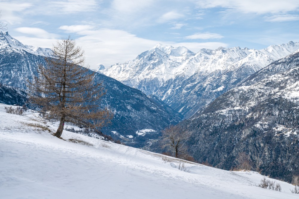 Der Panoramaweg Moosalp ist ein aussichtsreicher Winterwanderweg, der unterhalb des Skigebiets Moosalp von Törbel nach Bürchen führt. Dank breitem Trassee und meist geringem Gefälle eignet er sich auch für wenig erfahrene und untrainierte Wanderer. Den steilsten Abschnitt der ganzen Route gibt es gleich zum Einstieg. Vom Bergdorf Törbel führt der mit pinkfarbigen Tafeln signalisierte, maschinell gepfadete Winterwanderweg nach Bina. Danach geht es gleich deutlich weniger steil weiter zum alten Weiler Hostettu. Es lohnt sich, zwischendurch den Blick in die Gegenrichtung zu wenden: Die Aussicht auf die Kette der Viertausender, die das gegenüberliegende Saastal umgeben, ist grossartig. Nach einer Weile gelangt man in die Wildruhezone Märufälli. Die Route zieht sich nun während fast einer Stunde zwischen Nadelbäumen dahin, anfänglich in leichtem Anstieg. Im Gebiet Obere Helella wechselt das Gefälle: Jetzt geht es sanft abwärts. Der Streckenverlauf ist ab hier zusätzlich mit pinkfarbigen Stangen signalisiert. Schon bald betritt man offenes Gelände. Am Rand einer weiten, tief verschneiten Ebene befinden sich einige kleine Holzhüttchen, dazwischen stehen kleine Birken - die Szenerie mutet geradezu skandinavisch an, wären da nicht das Augstbordhorn, dessen wuchtiger Felsrücken im Süden in die Höhe ragt, und die gewaltige, ebenmässige Pyramide des Bietschhorns im Norden. Genussreich wandert man über die winterlich stille Hochebene. An deren Ende wird das Panorama noch grosszügiger: Im Westen öffnet sich nun auch die Sicht auf das Rhonetal und zu den westlichen Berner Alpen. In einem weiten Bogen senkt sich der Wanderweg sanft nach Zenhäusern, und schon bald erreicht man das Wintersportzentrum Ronalp mitten im ausgedehnten Siedlungsgebiet von Bürchen.