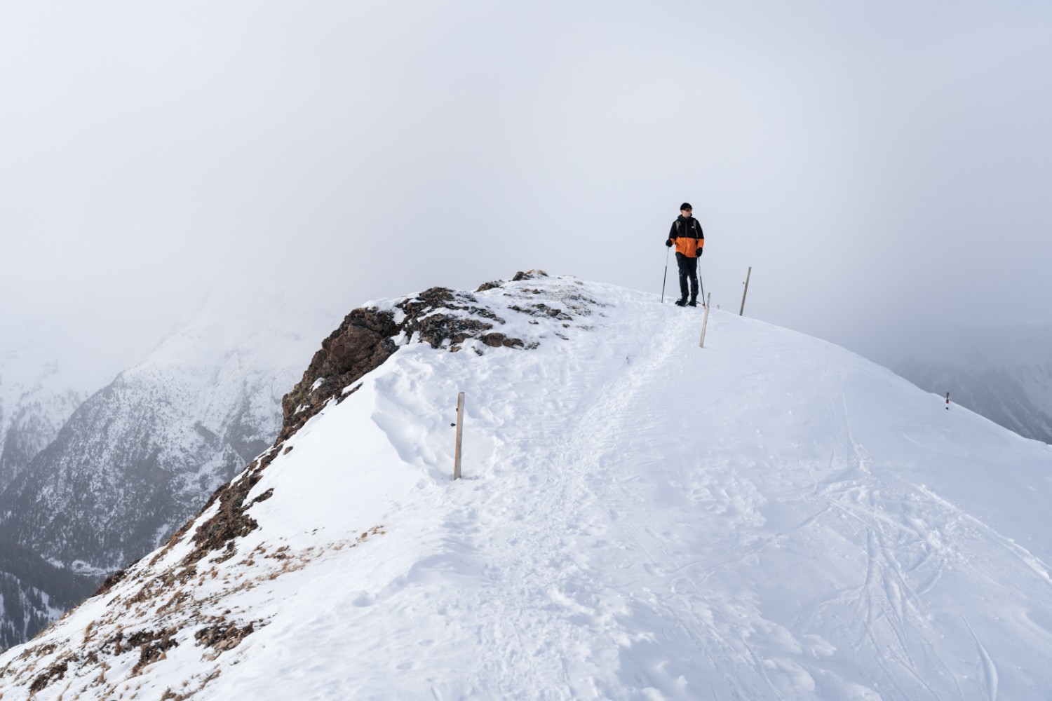 Oben angekommen geniesst man erst einmal die phänomenale Aussicht auf die Berglandschaft. Mit angeschnallten Schneeschuhen geht es der rechts liegenden Skipiste entlang zum Piz Darlux. Entgegengesetzt zu den ins Tal bretternden Wintersportler/innen gelangt man nach einigen Höhenmetern auf einen Sattel. Die erste Hälfte ist geschafft. Dem Grat folgend, nähert man sich Stück für Stück dem Bergüner Hausberg. Vorsicht ist mit Wechten geboten: bitte genügend Abstand zum Grat halten. Nach eineinhalb Stunden wird man auf dem Gipfel des Piz Darlux mit einem atemberaubenden Alpenpanorama auf den Piz Üertsch und den Piz Ela belohnt. Der Rückweg erfolgt auf gleicher Route. Die vorhin im Rücken gelegenen Piz Rugnux und Piz Spadlatscha sind jetzt zu sehen. Am Ende der Tour wärmt einen ein Getränk von der SnowHill Hütte wieder auf.