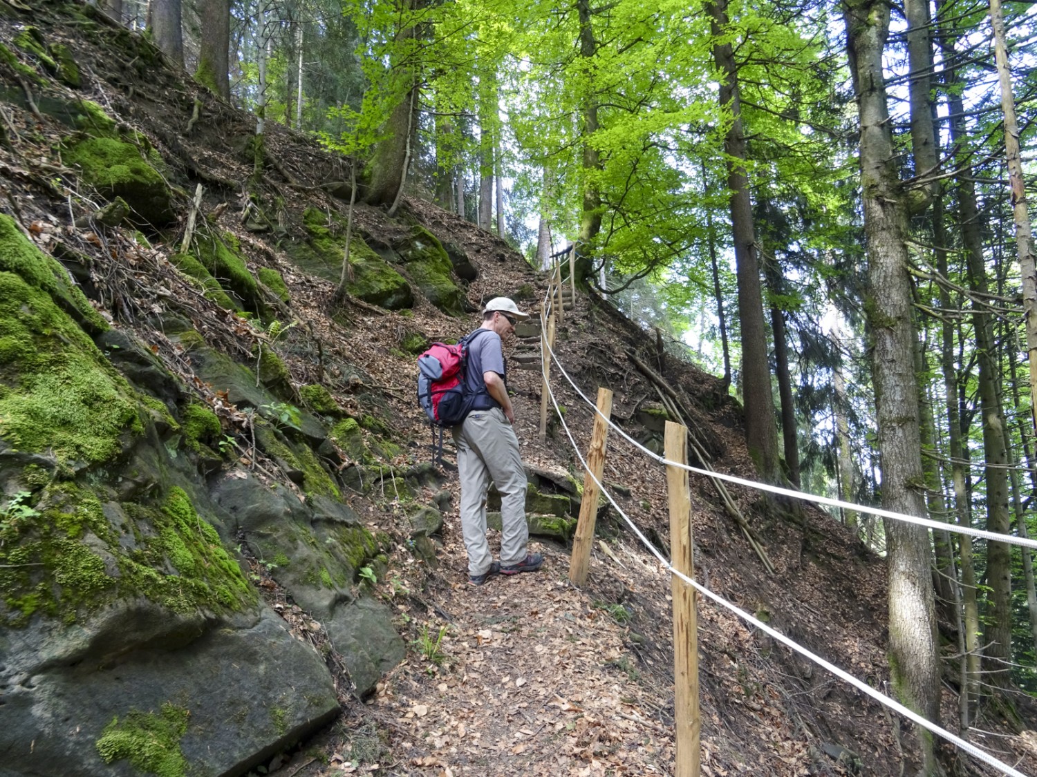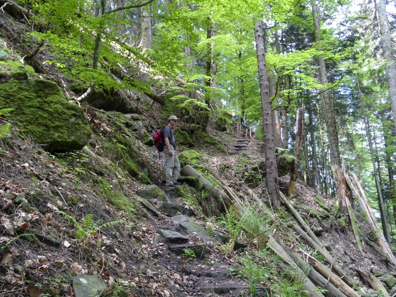 Guggisberg liegt idyllisch eingebettet zwischen saftigen grünen Wiesen. Gerade einmal 1700 Einwohner leben in der weitverzweigten Gemeinde, der Dorfkern mit der pittoresken Kirche ist überschaubar. Stündlich spuckt das Postauto ein paar Touristen aus, denn vor allem aus der nahen Stadt Bern ist Guggisberg ein beliebtes Ausflugsziel. Das bekannte Guggershörnli ein oft angesteuerter Aussichtspunkt. Für einmal soll aber der markante Fels links liegen gelassen werden: Am Friedhof vorbei steigt der Weg durch Wiesen ab bis Laubbach. Würde man hier der Teerstrasse nach rechts folgen, und in Hirschmatt links abbiegen, käme man zum Keltenhaus, wo jährlich Mitte August ein dreitägiges Keltenfest mit Bands und Handwerkskunst stattfindet. Der Wanderweg quert aber die Teerstrasse und steigt nun durch Wiesen an. Man passiert wie zufällig hingewürfelte Bauernhäuser und friedlich grasende Kühe. Nach einiger Zeit führt der Weg in den Schatten spendenden Wald. Die Vögel zwitschern, kein Motorenlärm stört die Stille, einzig Kuhglocken sind zu hören. Mitten im Wald gibt es nämlich eine grosse Lichtung, wo mehrere Kuhherden gesömmert werden. Erst bei Brönnti Egg öffnet sich die Sicht auf die Freiburger Alpen erneut - und auch hier, Kuhglockengebimmel von allen Seiten und mehrere Viehgatter, die bezwungen werden müssen. Nur Menschen sind keine zu sehen, diese machen sich hier rar. Der Weg steigt nun ziemlich steil durch Wiesen ab, er trifft unten im Tal bei Zollhaus auf die grosse Strasse, die von Plaffeien an den Schwarzsee führt und einen unmittelbar aus dem Kuhland zurück in die Realität befördert.