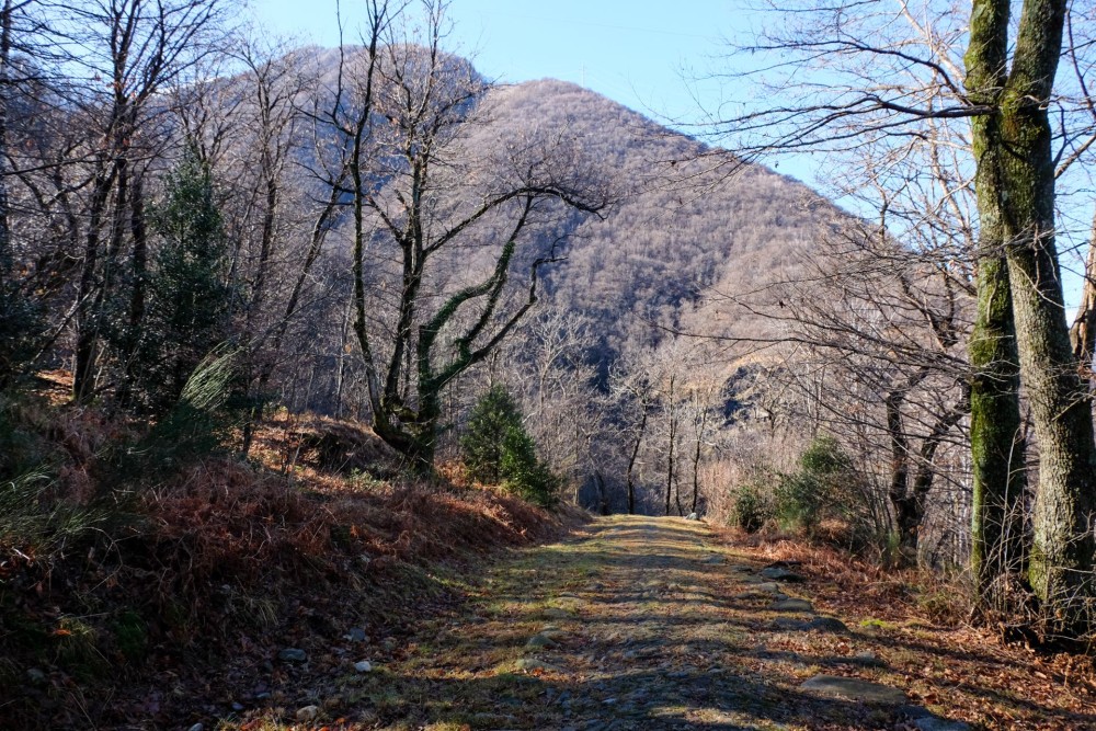 Bei der Haarnadelkurve, die in die Via San Giorgio führt, verlässt diese Wanderung die historische Strasse und folgt rechterhand dem Waldweg in Richtung Contone, einem der Dörfer am Rand der Magadinoebene.
