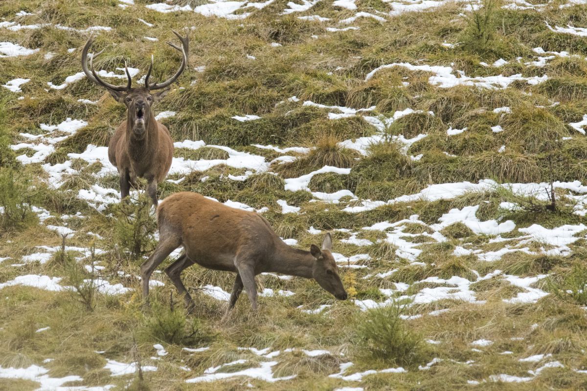 Une fois que les mâles adultes ont établi leur hiérarchie, le cerf dominant rejoint toute une harde de biches. La tâche épuisante de l’accouplement ne lui permet guère de se nourrir et il perd donc jusqu’à un tiers de son poids pendant le rut. Si cela ne fonctionne pas du premier coup, la biche ovule trois semaines plus tard, est à nouveau saillie et met presque certainement bas au printemps suivant. Avec son petit de l’année précédente, elle traverse un nouveau cycle annuel. A l’âge de 2 ans déjà, les jeunes biches peuvent être elles-mêmes gravides.