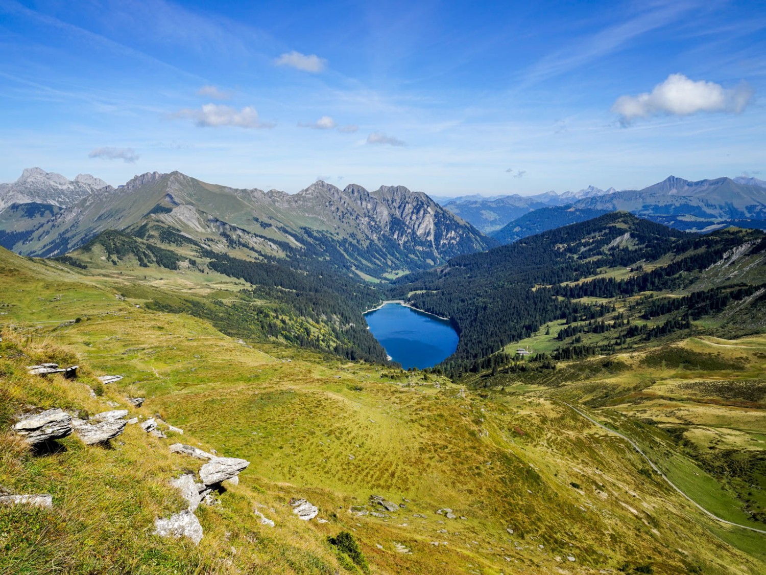 Le lac d’Arnon repose tel un œil sombre au fond d’une large vallée. Photo: Fredy Joss.