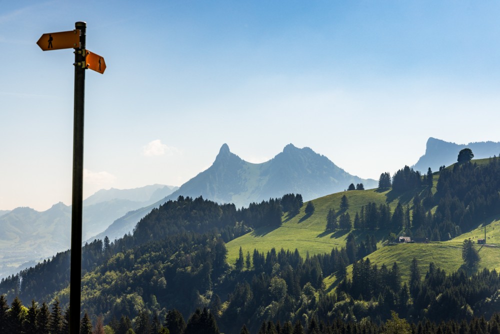 Les promeneurs qui arrivent au bon moment à Moléson-sur-Gruyères sentent d’emblée le parfum du Gruyère qui émane de la fromagerie de démonstration, toute proche. Pendant le trajet en funiculaire jusqu’à Plan-Francey, la face nord du Moléson, striée de bandes rocheuses, semble toujours plus raide. Tel une sentinelle têtue, le sommet impressionne par son isolement et sa forme conique massive et tronquée dans une région parsemée de dents et de vanils aiguisés. De Plan-Francey, le chemin contourne tout d’abord le sommet par sa face ouest. Bien aménagé, il monte et descend doucement à travers des prairies fleuries et des forêts clairsemées. C’est depuis le replat nommé Le Villard-Dessus que commence la vraie montée. Les randonneurs empruntent d’abord une petite route asphaltée puis gravissent un étroit sentier de montagne, très raide sur une courte distance, jusqu’à l’alpage Tremetta. Bientôt, ils atteignent la crête du Moléson. Il reste quelques mètres à franchir jusqu’au sommet, mais l’ascension se fait en douceur. Bien qu’il n’atteigne que 2000 mètres d’altitude, le Moléson offre un panorama exceptionnel grâce à sa situation isolée. Par temps clair, on aperçoit les Alpes de Suisse centrale, avec le Titlis, les célèbres sommets bernois, une série de 4000 mètres valaisans et le mont Blanc. On distingue aussi le lac Léman, qui scintille au sud-ouest, et les lacs de Neuchâtel, de Morat et de Bienne loin au nord. À propos du parfum du Gruyère: les auberges de Plan-Francey, de l’alpage du Gros-Plané et du Moléson, bien sûr, ne sont pas à dédaigner! Toutes ces adresses servent du Gruyère sous forme solide ou fondue.