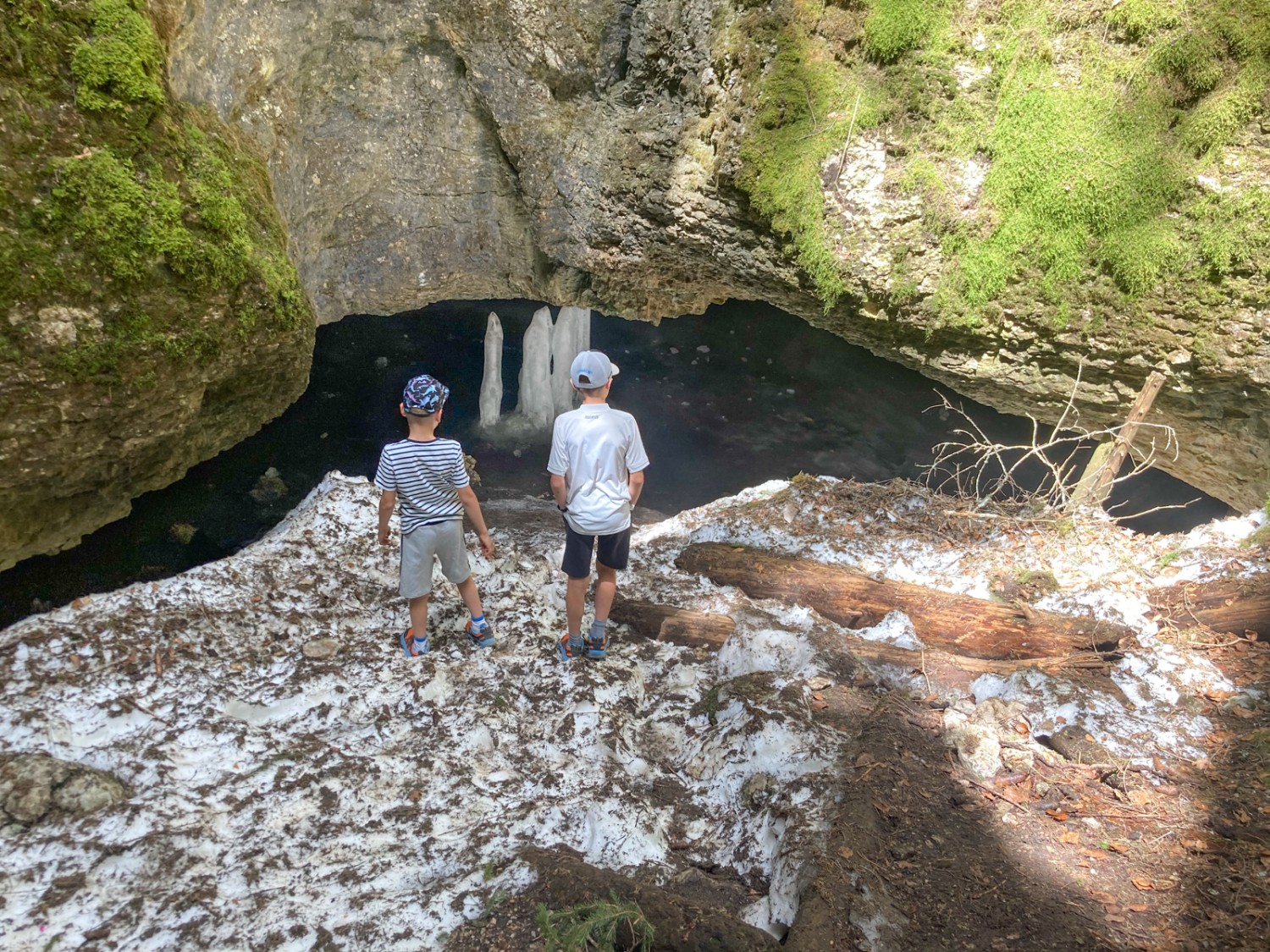 Devant l'entrée de la grotte: les grandes stalagmites sont déjà visibles. Photo : Anna Kocher.