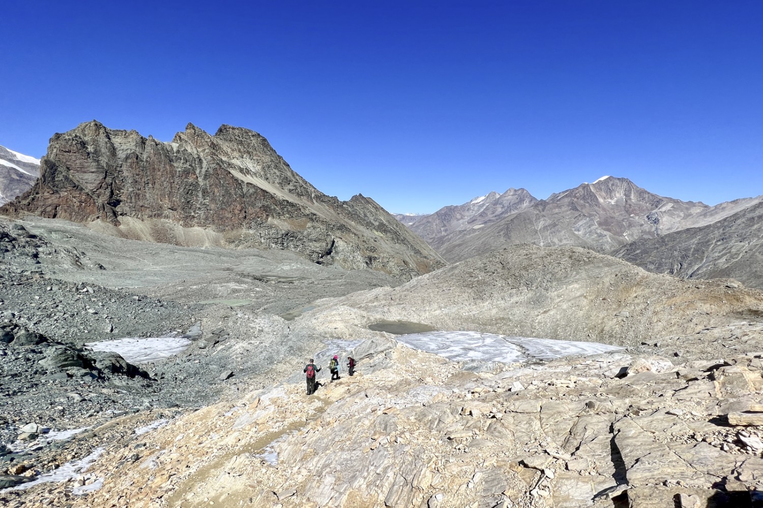 Peu avant Plattjen, vue sur le Weissmies, le Lagginhorn et le Fletschhorn. Photo: Pascal Bourquin.