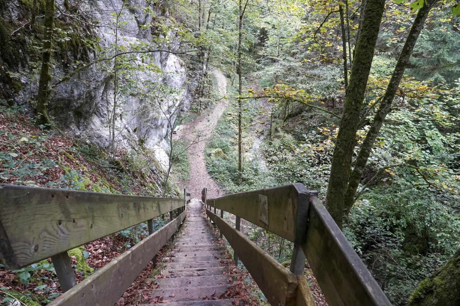 Les passages particulièrement étroits et raides des gorges de Perrefitte sont équipés d’escaliers et de passerelles. Photo : Reto Wissmann.
