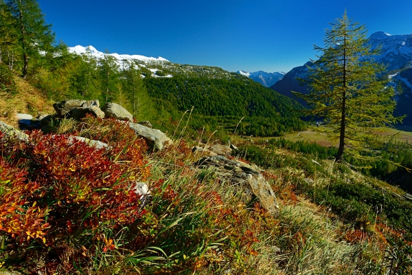 Cette randonnée sur la crête ressemble à un exercice sur la corde raide. On entame la balade sur un faîte d’où dévalent, de chaque côté, des pentes herbeuses à forte déclivité. Derrière le Roc d’Orzival, le chemin plonge sur la gauche dans le paysage hélas défiguré du domaine skiable de Grimentz. Le lendemain, à la droite de la crête, il emmène au vallon de Réchy, un petit bijou où la nature a encore tous ses droits, grâce à l’action de protecteurs de la nature. Durant les années 1980, il était en effet prévu d’y développer le ski. Heureusement, depuis 1998, cette petite vallée valaisanne est inscrite à l’Inventaire fédéral des paysages d’importance nationale, ce qui la préserve des atteintes. En parcourant la vallée de haut en bas, on fait un véritable voyage dans le temps et l’on découvre un paysage façonné par les glaciers et l’érosion. Le chemin s’élève sur une pente raide de la station supérieure de Crêt du Midi vers le sommet de La Brinta et la crête. Assuré par des chaînes et parfois exposé, un étroit sentier s’étire jusque vers les étranges formations rocheuses aux tons lumineux situées de l’autre côté, près du Roc d’Orzival. Ici, il ne faut pas souffrir du vertige. En traversant le domaine skiable et en montant brièvement de l’autre côté dans des éboulis, on rejoint derrière le col des Becs de Bosson la cabane du même nom où l’on peut dormir. Le jour suivant, le chemin descend dans le vallon de Réchy vers la plaine, d’abord à travers un paysage rocheux parsemé de dolines, qui n’est pas sans rappeler une zone arctique. Il passe ensuite par des prairies herbeuses comparables à des steppes et par des marais traversés par des méandres capricieux. En admirant les jeux d’eau, puis des cascades, on rejoint enfin un bisse que l’on suit à travers la forêt, jusqu’à Vercorin.
