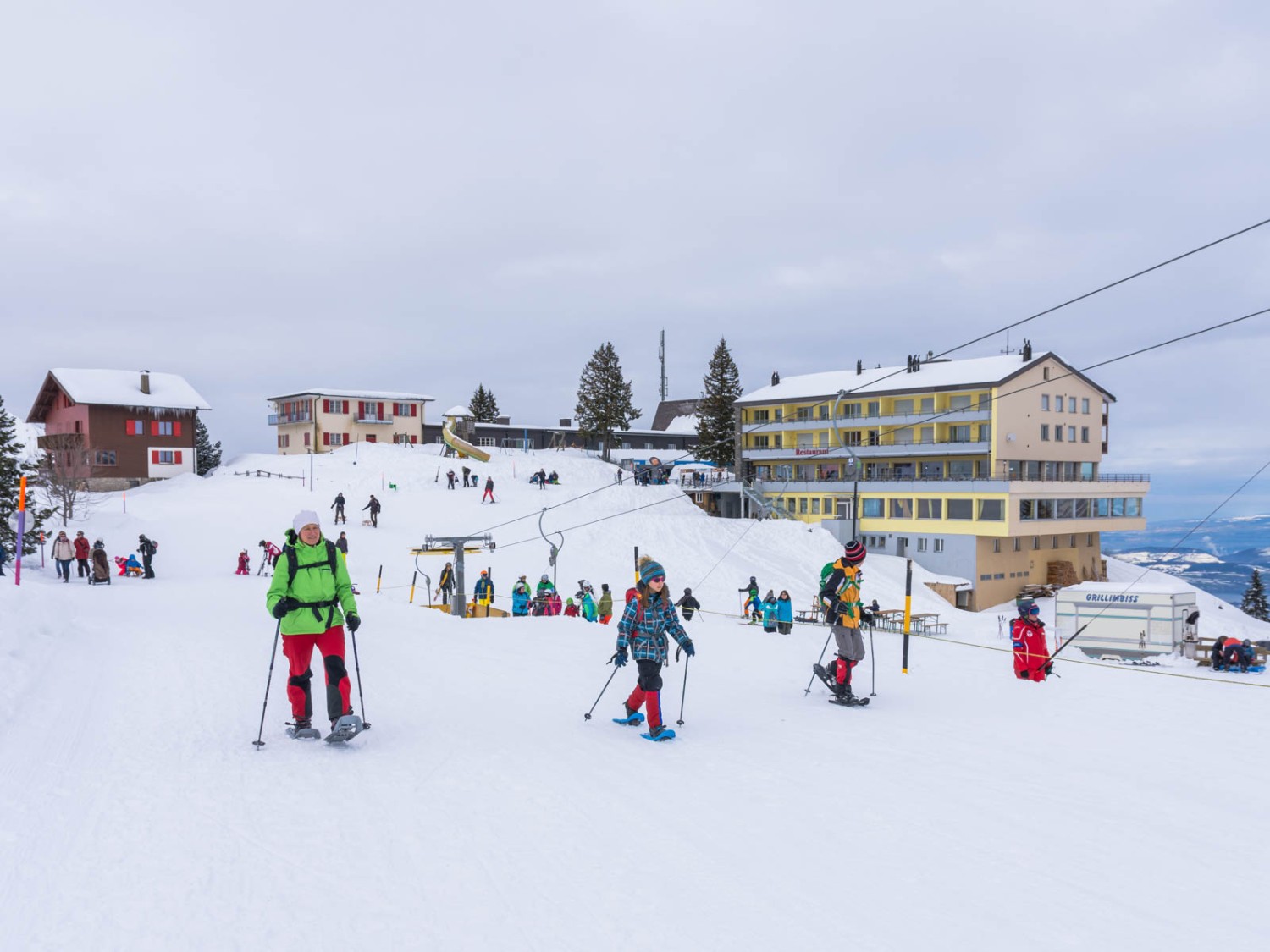 Im Winter verwandelt sich der Niederbauen in ein Schneeschuh-Mekka. Verschiedene Touren stehen zur Auswahl, alle beginnen beim Berggasthaus Niederbauen, das gleich bei der Gondelstation gelegen ist. Der gut präparierte Weg führt zuerst etwas bergan und dann flach ins Innere des Plateaus Richtung Alp Ebnet. Nach einigen Hundert Metern gilt es, sich für eine der Routen zu entscheiden.
