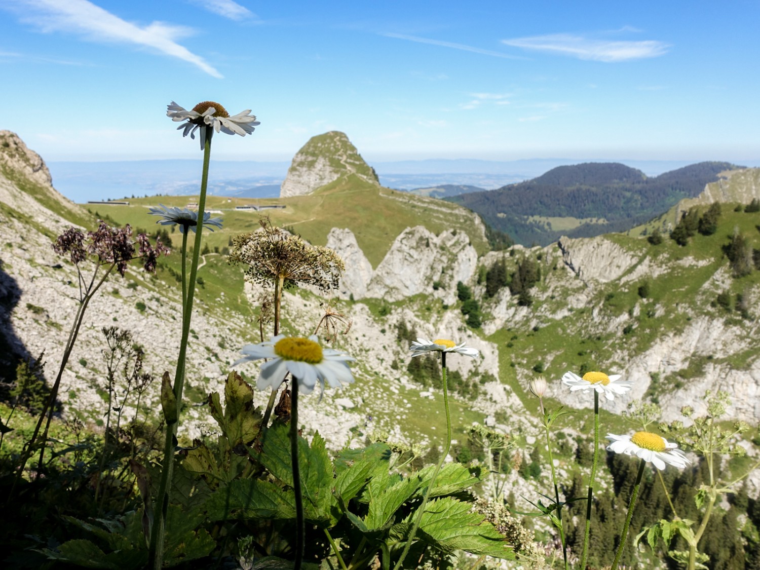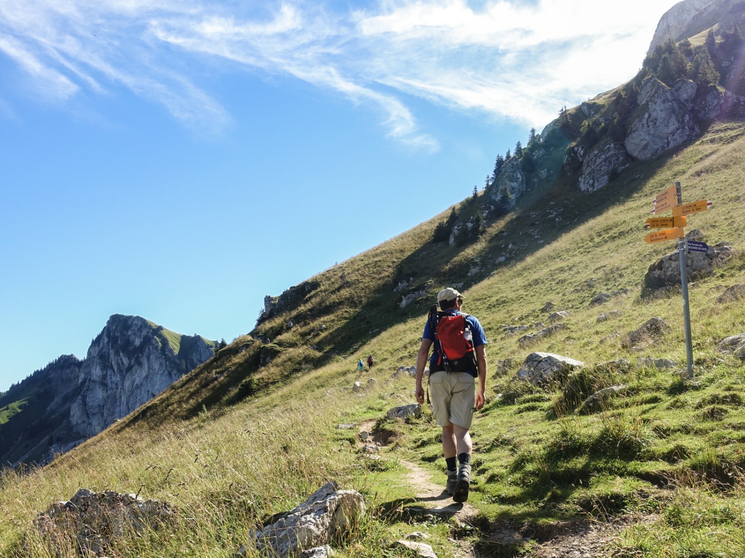 Die einspurige Zahnradbahn von Montreux auf den Rochers-de-Naye wurde in zwei Phasen erstellt: 1892 eröffnete die Strecke zwischen Glion und dem Rochers-de-Naye, und 1909 kam die Verbindung von Montreux nach Glion hinzu. Vom Gipfel aus geniesst man eine herrliche Aussicht auf den Genfersee und die Alpen sowie bis zur Jurakette. Der erste Teil der Route folgt dem südwestlichen, in Richtung Genfersee abfallenden Grat des Rochers-de-Naye – ein sehr angenehmer und malerischer Auftakt zur Wanderung. Nach einer hübschen Passage zwischen zwei Felswänden hindurch auf der Höhe von Sautodoz verläuft der Weg dem bewaldeten Grat entlang, vorbei an den Gipfeln von Les Dentaux und bis nach Le Creux à la Cierge. Kurz danach biegt die Route nach rechts ab, führt über den nordwestlichen, ebenfalls bewaldeten Hang des Rochers-de-Naye und eine abfallende Traverse bis nach Liboson d’en Haut und ab da auf Hartbelag bis nach Haut-de-Caux. Wer die Wanderung abkürzen möchte, kann hier die Bahn nehmen. Allerdings hat das letzte Teilstück quer durch das Dörfchen Caux noch eine besondere Attraktion zu bieten: das 1902 erbaute Caux Palace, damals eines der modernsten und luxuriösesten Hotels der Schweiz, das den Ort während der Belle Époque der 1910er-Jahre weitherum bekannt machte. Die beiden Weltkriege und die damit einhergehenden Krisenjahre führten dann aber dazu, dass die Auslastung markant zurückging und der Betrieb schliesslich eingestellt werden musste. Nach 1945 wurde das Caux Palace von Initiativen der Veränderung übernommen, einer internationalen Nichtregierungsorganisation, die sich für Frieden, Gerechtigkeit und Nachhaltigkeit einsetzt. Vom ehemaligen Hotel, in dem heute Konferenzen und Seminare stattfinden, sind es nur noch wenige Schritte bis zum Bahnhof von Caux, dem Ziel der Wanderung.