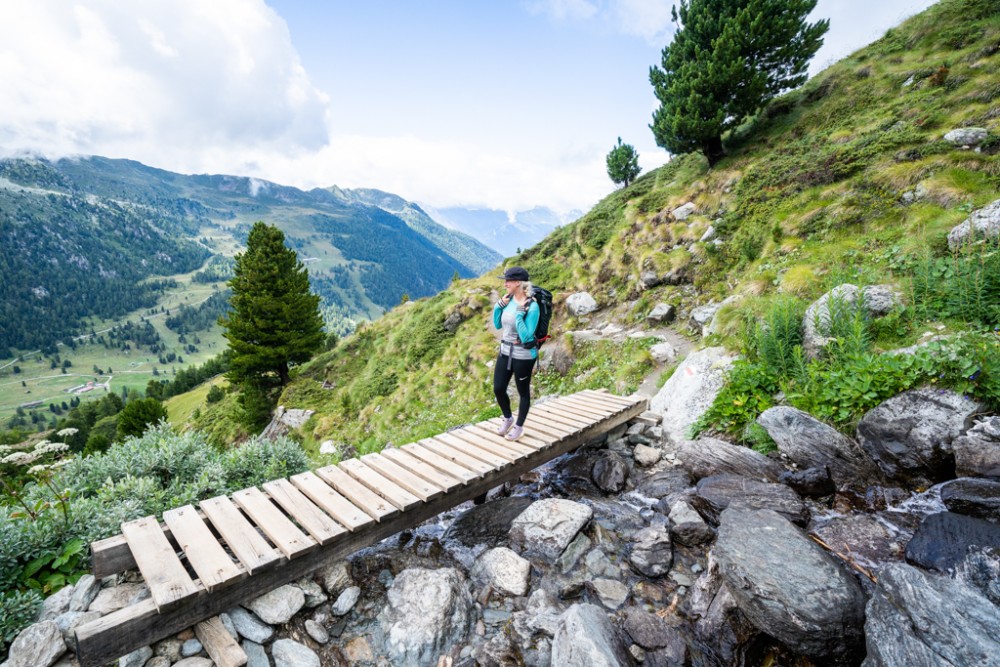 • Brücke entlang der Bisse de Chervé mit dem Rhonetal im Hintergrund. Bild: Wanderblondies
