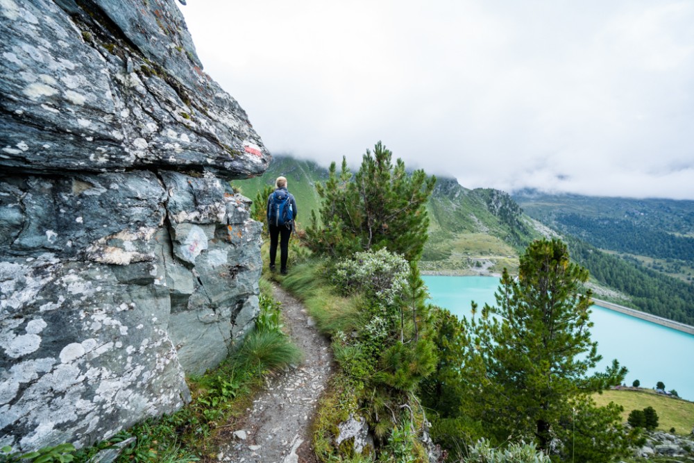 Hoch oben entlang der Bisse de Chervé mit Aussicht auf den Lac de Cleuson. Bild: Wanderblondies.