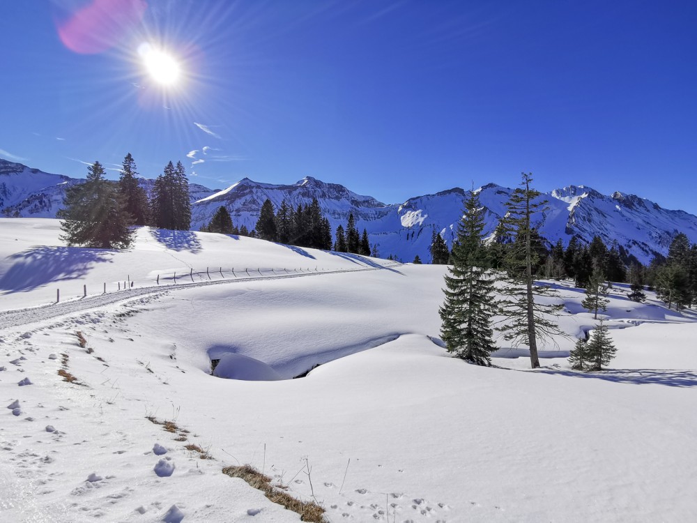 Sörenberg verfügt über ausgedehnte Moorlandschaften. Die Gebiete weisen grosse ökologische Qualitäten auf und bieten zugleich einen sehr reizvollen Anblick. Riedgräser und lockere Bestände von Nadelbäumen bringen im Sommer und Herbst viel Farbe in die Landschaft. Im Winter, wenn die Pracht unter einem Schneeteppich verborgen ist, sind die Moorgebiete stille und abgeschiedene Kleinode. Eines dieser Landschaftsjuwelen ist das Totmoos. Es liegt am Sonnenhang hoch über der Waldemme. Ein Winterwanderweg führt vom Dorf hinauf. Der Aufstieg verläuft fast durchwegs über Alpweiden. Das offene Gelände ermöglicht eine ungehinderte Aussicht zur Brienzer-Rothorn-Kette auf der gegenüberliegenden Talseite. Zurück ins Tal geht es auf der Glaubenbielen-Passstrasse. Im Winter ist diese für Motorfahrzeuge gesperrt. Es lohnt sich jedoch, die Wanderung nur dann zu unternehmen, wenn auch wirklich Schnee liegt, denn sonst marschiert man für längere Zeit auf Asphalt. Allerdings ist dieser Abschnitt ohnehin relativ schneesicher, denn das Gebiet liegt im Dezember und Januar mehrheitlich im Schatten. Wer eine möglichst sonnenreiche Tour wünscht, sollte sich somit erst ab Februar auf den Weg machen.