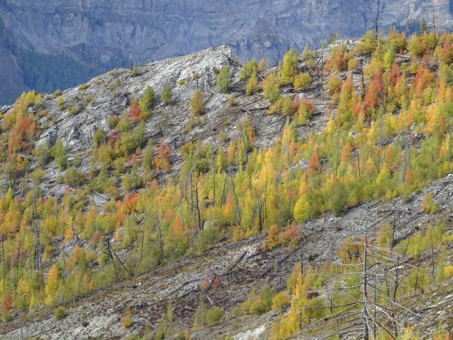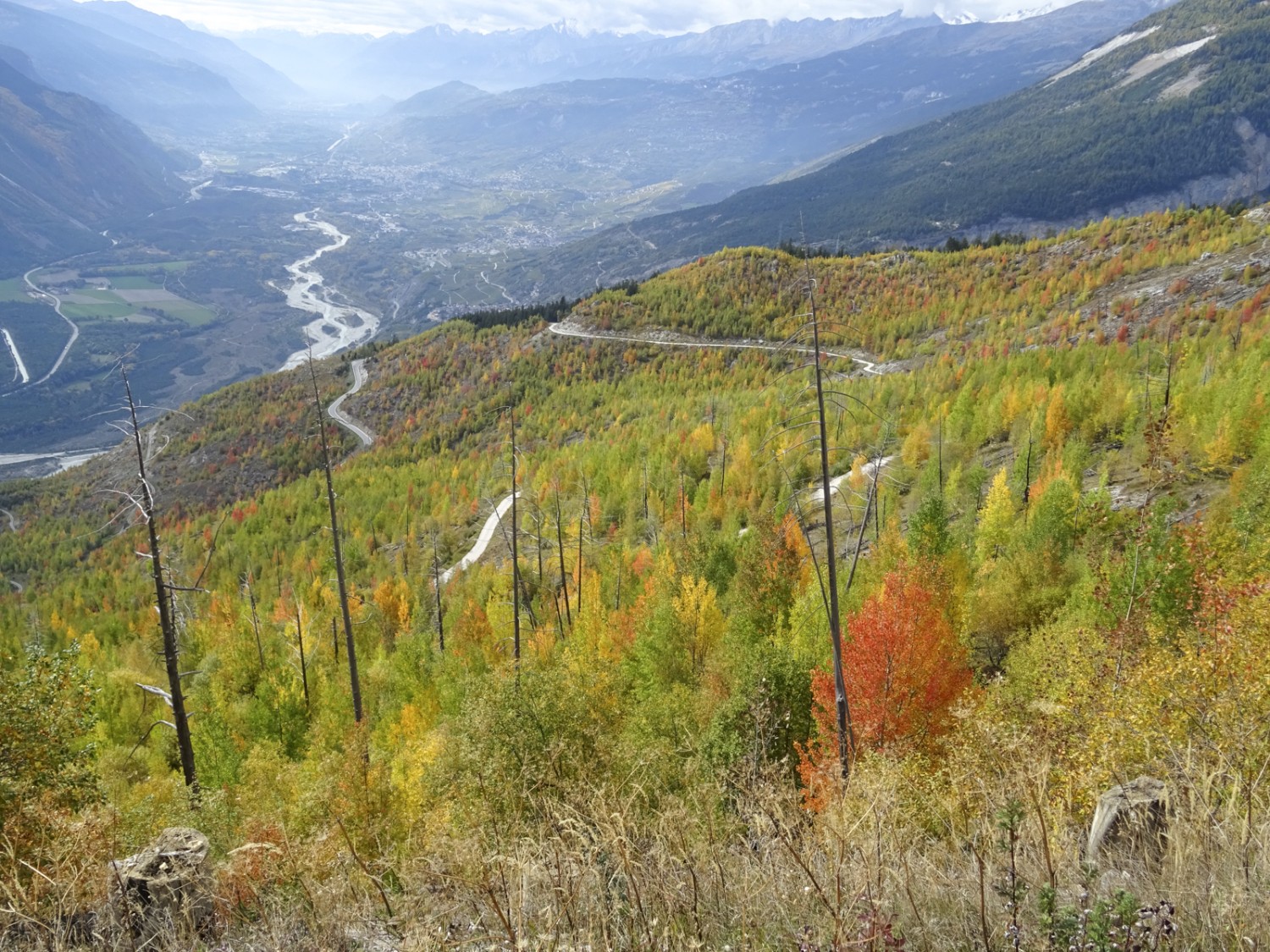 Von der Bergstation Torrentalp führt die Wanderung als aussichtsreicher Höhenweg durch Lärchenwälder und an Alpweiden vorbei. Im Westen erhebt sich die imposante Felsarena von Leukerbad, im Süden reihen sich Drei- und Viertausender aneinander, und unten im Rhonetal breiten sich Häuser und Strassen in Spielzeuggrösse aus. Vom Waldbrand ist von hier aus noch nichts zu sehen. Nach einem kurzen Aufstieg ist beim Obere Guggerhubel der Rand des Waldbrandgebiets erreicht. Bis hier hinauf rasten damals die Flammen. Noch heute, 20 Jahre später, stehen viele verbrannte Bäume aufrecht wie Gerippe über den noch niedrigen, nachwachsenden Jungbäumen. Der Abstieg durch unversehrten Wald mit mächtigen Lärchen, Fichten und Waldföhren vermittelt einen Eindruck davon, wie es im Waldbrandgebiet früher ausgesehen hat. Weiter unten führt der Wanderweg nochmals durch den nachwachsenden Wald, den Zitterpappeln, Birken und Weiden im Herbst besonders farbenfroh schmücken.
