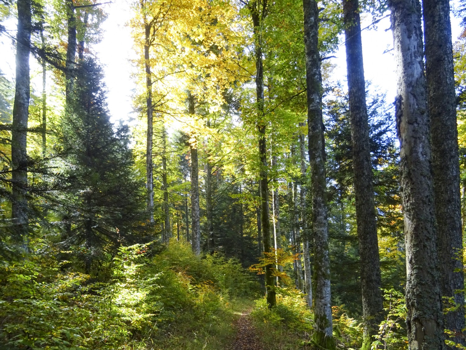 • Im Abstieg nach La Presta: Dieser Mischwald ist besser vor Sturmereignissen geschützt als ein reiner Fichtenwald. Bild: Sabine Joss