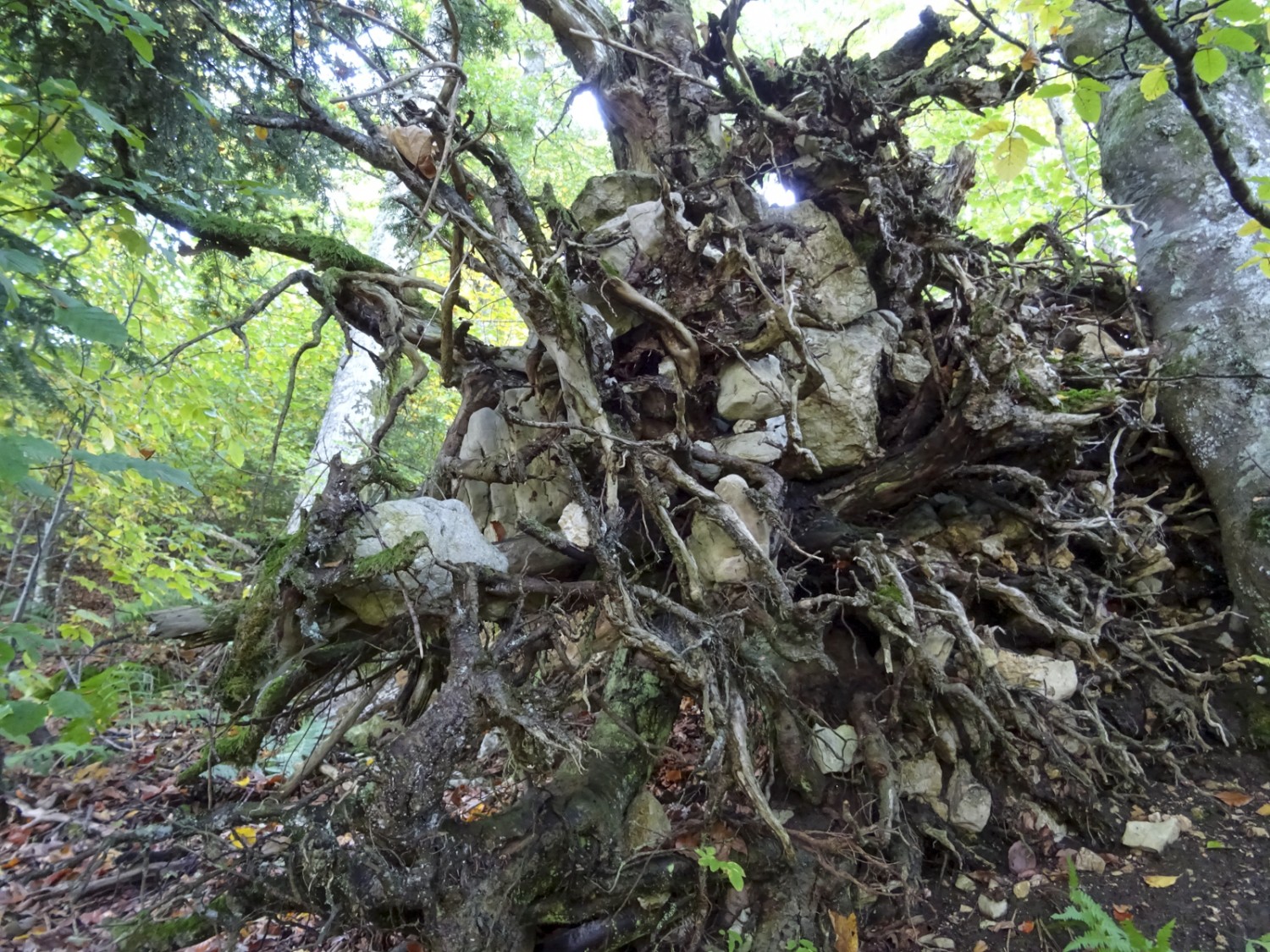 Der Wurzelteller zeigt, dass der umgestürzte Baum nur flach verankert war. Bild: Sabine Joss.