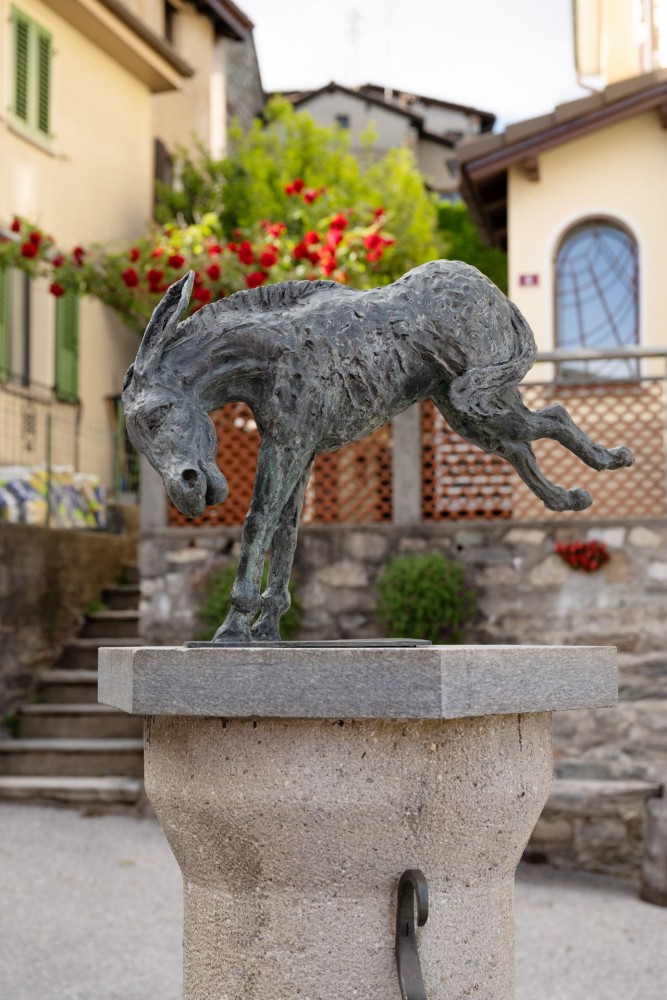 • A Breno, un asino attende escursioniste ed escursionisti sulla fontana.