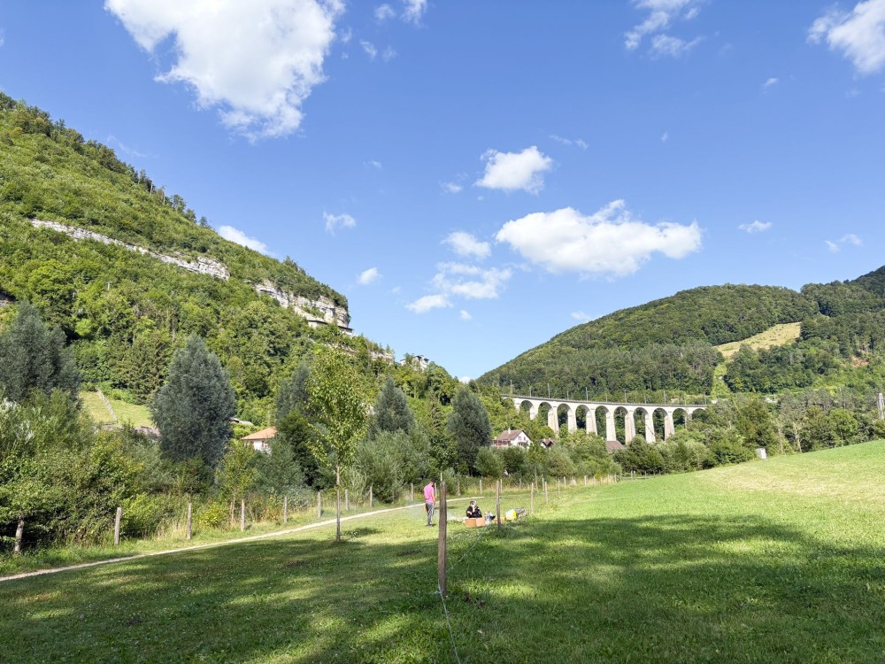 Veduta dall’albergo Le Relais du Doubs poco prima di Soubey.. Vignetta: Gaby Häring