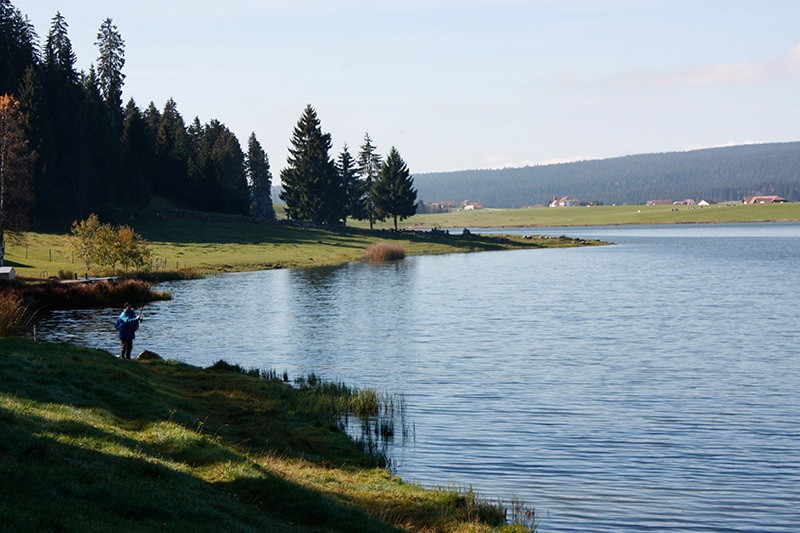 • Der malerische Lac des Taillères mit Fischer. Bild: Anne-Sophie Scholl